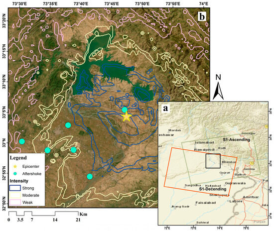 Intensity map of Mirpur earthquake showing shaking intensity following the earthquake with strong shaking observed in the study area (data provided by USGS). (a) Black rectangular shows study area of Mirpur, Pakistan (derived from Open Street Map). The green rectangle shows the ascending swath of Sentinel-1 IW SLC images and the red rectangle shows the descending swath of Sentinel-1 IW SLC images that are used for this study. (b) Contour lines with different colors indicate the intensity of the earthquake, while yellow color star shows the epicenter of the 24 September 2019 Mirpur earthquake; the turquoise color dots show the aftershocks occurring for up to one month (from 24 September 2019 to 22 October 2019) after the mainshock (USGS, 2019).