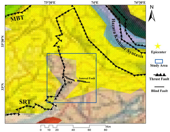 The regional tectonic map shows major geological formations and faults of northwestern Pakistan. Blue rectangle indicates the study area and yellow color star shows the epicenter of the 24 September 2019 Mirpur earthquake. Solid black lines show positions of major geological faults and their divisions, and black circular dotted lines show the identified blind faults in the study area.