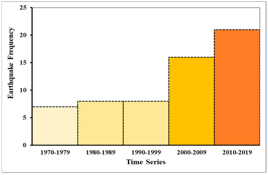 The Jhelum Fault Lines lie on the western limb of the Hazara Kashmir Syntaxis (HKS). HKS is a complex tectonic zone composed of sedimentary, volcanic, and metamorphic rocks of Pre-Cambrian to Neogene, and marks the eastern boundary with the Nanga Partbat-Haramosh Massif [37]. The Jhelum fault passes through the Panjar and Ziarat area on the right bank of river Jhelum. It is a left-lateral strike-slip fault with subordinate reverse motion. The shearing, crushing, fault breccia and gauge are present along the fault zone [38]. Historic data on the occurrence of earthquake events in the region obtained from the USGS showed that the number of earthquakes in the Mirpur and adjacent areas has progressively increased, and a dramatic increase was seen over the last two decades (Figure 3).