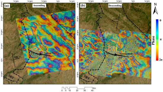 Wrapped co-seismic deformation interferograms derived from the Sentinel-1 data. (a) The interferogram is derived from ascending orbit (16 September 2019 to 28 September 2019) and (b) the interferogram is derived from descending orbit (17 September 2019 to 29 September 2019). The solid black lines denote the estimated locations of the thrust faults and black circular dotted lines show the identified blind faults in the study area. The black star indicates the epicenter of the 24 September 2019 Mirpur earthquake derived from USGS data.