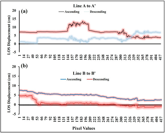 Graphs based on extracted values of LOS displacement by dotted lines shown in Figure 6, (a) shows the LOS displacement for line A to A′ of both ascending and descending orbit and (b) shows the LOS displacement for line B to B′ of both ascending and descending orbit of Sentinel-1 data.