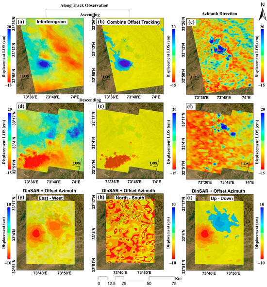 Shows the interferometric and combined offset tracking results. (a,d) surface displacement results (without atmospheric correction applied) derived from the interferometry in both descending and ascending orbits of Sentinel-1 images, respectively, and (b,e) surface displacement results retrieved from the combined offset tracking in both descending and ascending orbits of Sentinel-1 images. Where (c,f) surface displacement results obtained along the azimuth direction for both ascending and descending orbits of Sentinel-1 images, respectively. (g–i) Three-dimensional (3D) co-seismic deformation map based on the ascending and descending orbit LOS displacements (from DInSAR) and azimuth displacement (from offset tracking) in the east–west, north–south, and up-down directions, respectively.