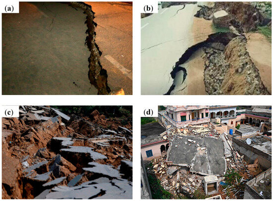 Photos of surface displacement in Mirpur, Pakistan taken on 25 September 2019, one day after the earthquake (National Disaster Management Authority). (a) Shows the ground photos of secondary faulting observed after the earthquake stroke. (b,d) Show the structure collapse due to the earthquake in Mirpur, Pakistan. (c) Shows the rocks sliding damaged the small road in Mirpur, Pakistan.