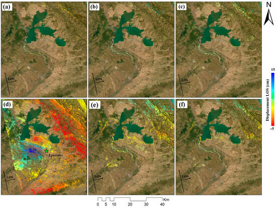 Since InSAR processing has also been investigated as a promising technique for the search of earthquake precursors [67], we have analyzed InSAR multi-temporal data for the detection of pre- to post-seismic ground displacements. We noted that the 24 September 2019 Mirpur earthquake occurred in a region of Pakistan where the tectonic regime is primarily compressional due to the collision between the Indian Plate and the Eurasian Plate. Detecting pre-seismic deformations in such settings can be challenging. For this kind of analysis, three interferograms were generated starting from pre-seismic data (Figure 10a–c), one interferogram from co-seismic data (Figure 10d), and two interferograms from post-seismic data (Figure 10e,f).
