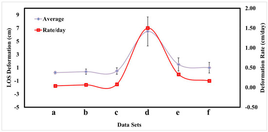 The temporal variations in average displacement along the LOS and the rate of change in regional displacement per day along the LOS estimated during the pre-seismic, co-seismic and post-seismic time periods from 11 August 2019 to 22 October 2019 are shown in Figure 11. InSAR analysis reveals that there was no deformation in the pre-seismic results from 11 August 2019 to 16 September 2019 (Figure 10a–c), as only small displacements from 0 cm to 1 cm are observed in parts (northeastern side) of the study area. The average displacement of about 0.38 cm was observed within 36 days, with a displacement rate of 0.06 cm/day, as shown in Figure 11 (Data Sets a–c). This displacement might be due to atmospheric or topographic artifacts. Indeed, standard APS and DEM corrections have been applied in the data preprocessing (see Section 2.1) that may have left negligible artifacts.
