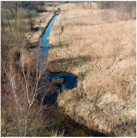 Small surface streams of the first and second order (according to Strahler’s classification [22]) constitute 70–80% of the length of all rivers in the world and play a significant role in hydrological systems and provide an ecosystem for living organisms [23]. Satellite measurements with limited spatial resolution lack the capability to offer useful WSE measurements for small streams. In this regard, measurement techniques based on unmanned aerial vehicles (UAVs) are promising in many key aspects, as they provide observations in high spatial and temporal resolution, their deployment is simple and fast, and can be used in inaccessible locations [24].