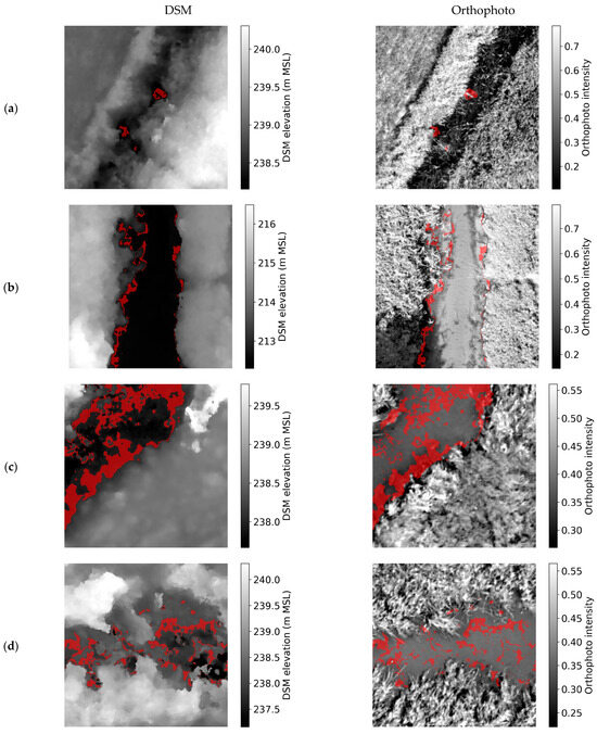 Example DSM and orthophoto dataset samples (a–d) with marked areas where the DSM equals the actual WSE ± 5 cm (red color).