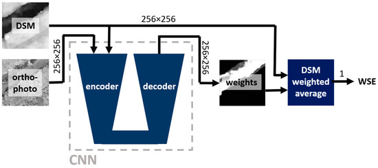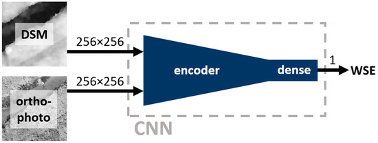 In this study, a deep learning (DL) convolutional neural network (CNN) is utilized to estimate a WSE from a DSM and an orthophoto. Two approaches are tested: direct regression of WSE using an encoder and a solution based on the weighted average of the DSM using a weight mask predicted by an autoencoder network. Note that the proposed approaches will be referred to hereafter as “direct regression” and “mask averaging”. Figure 5 and Figure 6 depict schematic representations of the proposed approaches. A third framework, which combines elements from the two mentioned ones, was also tested. However, it did not yield significantly improved results. Further details can be found in Appendix B.