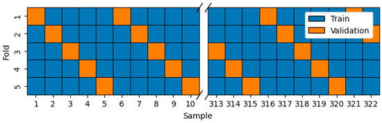 Stratified folds were generated by selecting for validation samples at intervals of every fifth element from the entire dataset. A total of 5 folds were created. The validation subset in each fold contained a comparable number of samples representing each of the case studies. The illustration in Figure 7 highlights the selection of validation subsets for each of the 5 folds.