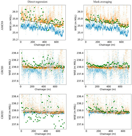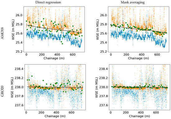 Photogrammetric structure-from-motion (SFM) algorithms are able to generate orthophotos and digital surface models (DSMs) of terrain from multiple aerial photographs. Photogrammetric DSMs are precise in determining the elevation of solid surfaces to within a few centimeters [26,27], but water surfaces are usually falsely stated. This is related to the fact that the general principle of SFM algorithms is based on the automatic search for distinguishable and static terrain points that appear in several images showing these points from different perspectives. The surface of water lacks such points as it is uniform, transparent, and in motion. The transparency of the water makes the surface level of the stream depicted on the photogrammetric DSM lower than in reality. The stream bottom is represented by photogrammetric DSMs for clear and shallow streams [28]. Photogrammetric DSMs for opaque water bodies are affected by artifacts brought on by lack of distinguishable key points [29]. The above factors make the measurement of WSE by direct DSM sampling yield results with high uncertainty. Some studies report that it is possible to read the WSE from a photogrammetric DSM near streambank where the stream is shallow and there are no undesirable effects associated with light penetration below the water surface [29,30,31]. However, this method gives satisfactory results only for unvegetated and smoothly sloping streambanks where the boundary line between the water and the land is easy to define [25]. For this reason, this method is not suitable for many streams that do not meet these conditions.