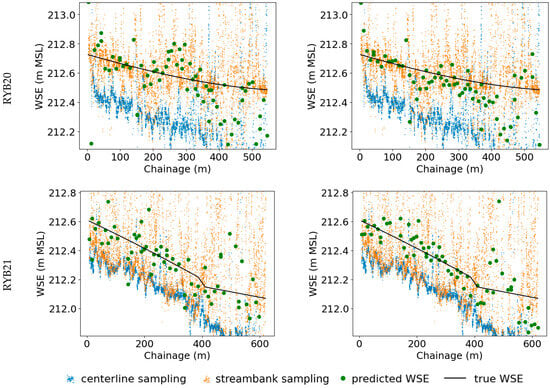 The data acquired in this study allow for the use of straightforward methods for determining WSE through sampling from photogrammetric DSM along the stream centerline and at the streambank [25]. These readings will be used for baseline comparison with the proposed method. The polylines used for sampling were determined manually, without employing any algorithm. Sampling was performed with care, especially in the water-edge method, where attention was given to ensuring that samples were consistently taken from the water area, albeit possibly close to the streambank.