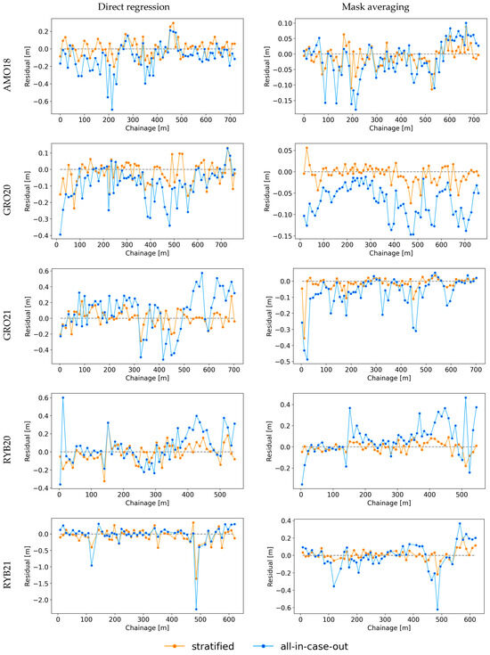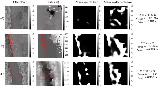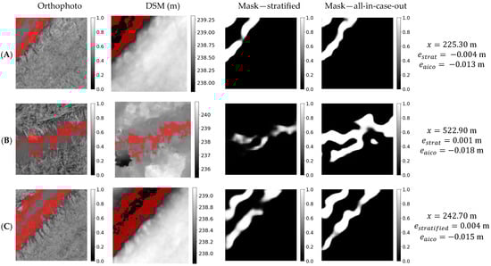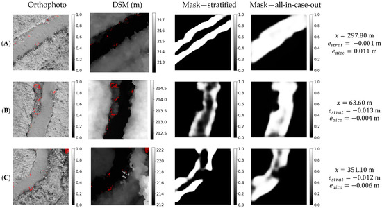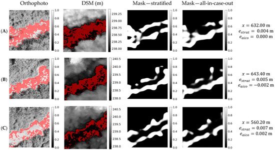 Accuracy metrics were calculated for all cross-validation methods, case studies, and approach variants. The root mean square error (RMSE), mean absolute error (MAE), and mean bias error (MBE) metrics were used. As a comparison with existing methods using photogrammetric DSM to read WSE in a small stream, the same set of metrics was calculated for values sampled from DSM near the streambank and at the centerline. The results are shown in Table 4, Table 5 and Table 6.