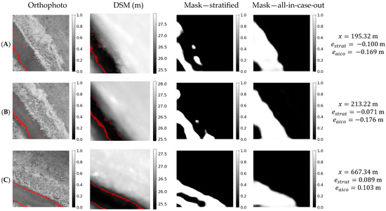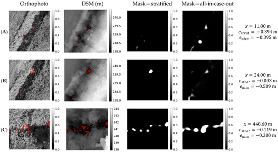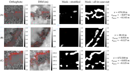 Figure 4 shows example dataset samples with marked areas where the DSM equals the actual WSE ± 5 cm. It can be seen that the patterns are not straightforward and in places do not meet the rule saying that the water level read from the DSM at the streambank corresponds to the WSE.