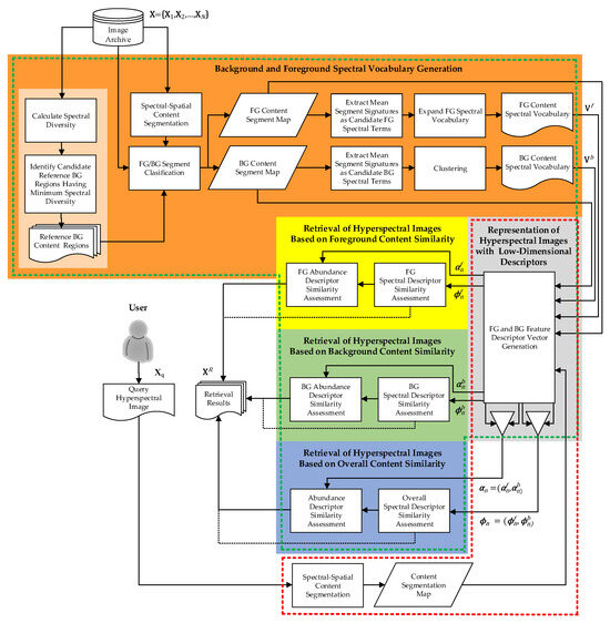 Unlike the existing CBHIRs reviewed in Section 2, which dominantly measure the similarity between two hyperspectral images by employing endmember matching-based methods, the system proposed in this study addresses content-based hyperspectral image retrieval with a semantic approach. The proposed system assumes that a hyperspectral remote sensing image archive comprises two types of content: (i) foreground and (ii) background.