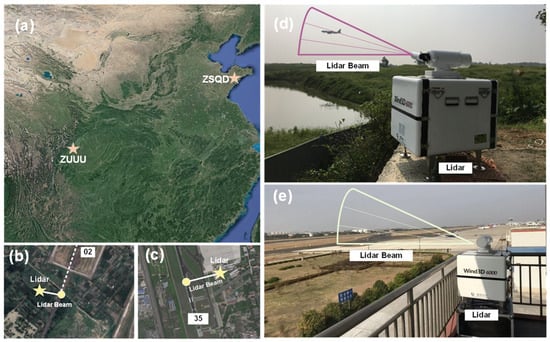 The locations of Chengdu Shuangliu International Airport (ZUUU) and Qingdao Liuting International Airport (ZSQD) are shown in Figure 1a. The former is a subtropical monsoon climate with high temperature and humidity in summer, located in the basin. The latter is a temperate monsoon climate, with high wind speed in spring, located in the coastal hills. The number of effectively observed aircraft sorties exceeded 4000 (totally observed sorties > 8000), with the lidar configured at ZUUU from August 2018 to September 2018 and at ZSQD from November 2019 to June 2020, respectively. The PCDL at ZUUU was configured southeast of Runway 02, about 1400 m vertically from the landing point, aiming to observe landing aircraft, as shown in Figure 1b,d. The PCDL at ZSQD was configured southeast of Runway 35, about 400 m away from the observation positions, to observe aircraft in the take-off phase, as shown in Figure 1c,e.
