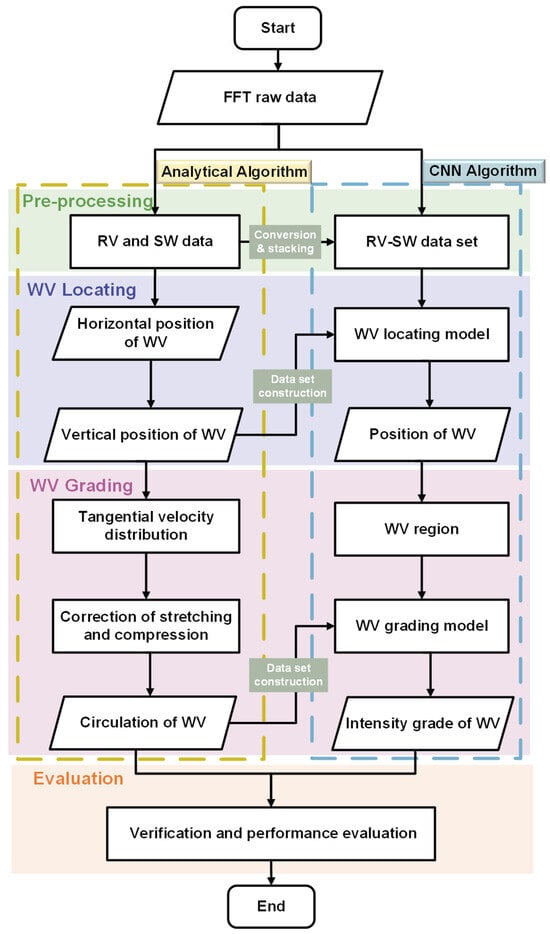 The algorithm of aircraft wake vortex locating and grading consists of four parts—data pre-processing, WV locating, WV grading, and model evaluation—as shown in Figure 2. A detailed description of all the parts will be provided in the following sections.