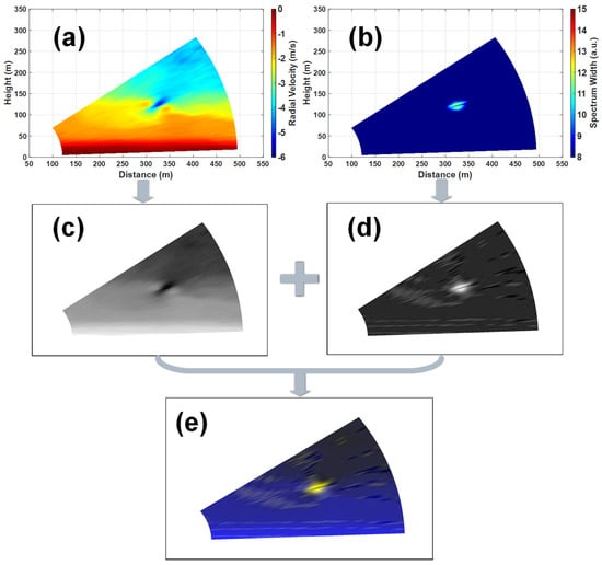 Thus, the RV-SW data set is used in this paper, to incorporate as much information as possible. The radial velocity image and spectrum width image are converted to gray-scale and stacked to obtain the RV-SW data set, aiming to combine the wind pair features in radial velocity with the broadening features in spectrum width. The gray-scale images of radial velocity and spectrum width are shown in Figure 3c,d, with the grays-cale range from 0 to 255, where the brighter color represents a larger value. The stacked image is shown in Figure 3e, where the ratio of radial velocity to spectrum width was 1:2.