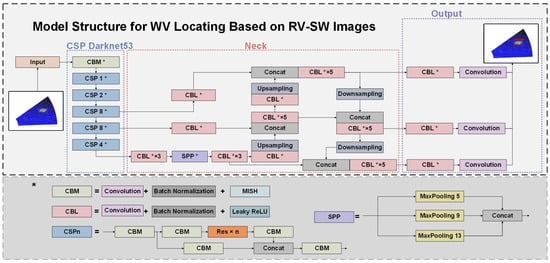 YOLO v4 consists of three parts: CSP Darknet53 is the main backbone, Spatial Pyramid Pooling (SPP) and Path Aggregation Network (PAN) are the neck network, and the YOLO head is the prediction structure. The CSPNet enables rich gradient combinations with less computational effort and higher accuracy, reducing computational bottlenecks and costs and enhancing learning ability [26]. The SPP is utilized as a solution for the problem of fixed-size constraints when dealing with the images [27]. The PAN is employed to boost the flow of information, achieving better feature fusion [28]. The head of YOLO v4 obtains the results of recognition using the obtained features, the same as the head of YOLO v3 [29]. The model mainly employs the CIoU (Complete-Intersection over Union) loss as the bounding box location loss [30], of which the confidence loss and classification loss are the same as YOLO v3. The structure of the WV locating model is shown in Figure 5.