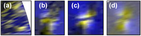 The WV region data set after extracting the wake vortex feature from the RV-SW data set, where the brighter color represents a larger value. (a) Example of Grade 0. (b) Example of Grade 1. (c) Example of Grade 2. (d) Example of Grade 3.