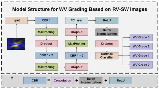 The Visual Geometry Group (VGG) network was proposed for the improvement of the model’s accuracy by increasing its depth steadily by only using very small convolution filters [32]. In VGG networks, the 3 × 3 convolution filters are stacked to achieve the same effective receptive field of larger filters, and the 2 × 2 max-pooling layers are used after each convolutional layer to reduce the computation of the model. A more compact VGG network structure is used for wake vortex classification to reduce feature parameters and save computing costs, which could significantly increase the ability to obtain image features and improve the model’s performance. Only one fully connected layer with the ReLU activation function is applied differently from the three connected layers in classic VGG networks. The model structure for WV grading is shown in Figure 7.