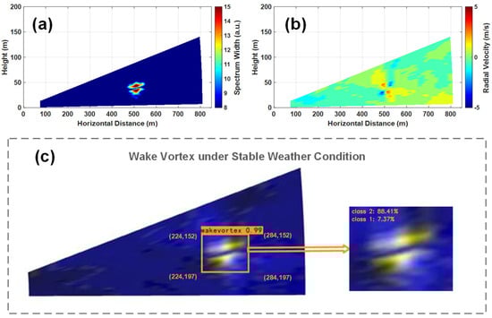 The images and results of the wake vortex under stable meteorological condition. (a) Spectrum width image of the wake vortex. (b) Radial velocity image of the wake vortex. (c) Results of WV locating and grading models when applied on the wake vortex, where the brighter color represents a larger value.