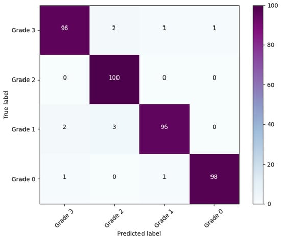 The confusion matrix is used to evaluate the feasibility of the WV grading model, as shown in Figure 10. Where the horizontal axis represents the predicted results and the vertical axis represents the true results. The model performs better in Grades 0 and 2, the reason for which may be that the wake vortex features of Grades 0 and 2 are more unique. The former has more chaotic image features, and the latter has a clearer wake vortex structure. The features of the wake vortex of Grade 1 and 3 are not clear enough due to the high wind speed or the dissipating wake vortex.