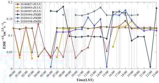 We selected typical historical meteorological data for clear, cloudy, and rainy days to compute the EDR1/3 during the observation periods at ZUUU and ZSQD, as illustrated in Figure 11. The results for ZUUU are indicated by round dots, while the results for ZSQD are indicated by diamond dots. Specifically, the results for 27 August, 5 September, and 7 September 2018 correspond to clear, rainy, and cloudy days, respectively, from Shuangliu District, Chengdu City, while those for 6 April, 12 April, and 8 May 2020 correspond to cloudy, clear, and rainy days, respectively, from Chengyang District, Qingdao City. Among the selected historical data, Chengdu exhibited higher temperatures ranging from 18 to 33 degrees Celsius, with background wind conditions being calm or light breezes; Qingdao had lower temperatures between 4 and 17 degrees Celsius, with background wind fields consisting of southeast wind at a force of two, northwest wind at a force of three, and east wind at a force of three.