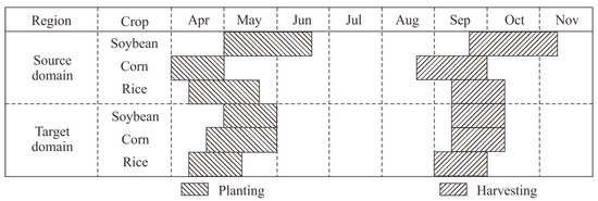 Both the U.S. and China are crucial agricultural producers on a global scale [47]. The U.S. conducts agricultural surveys annually to obtain sufficient crop samples and then combines satellite remote sensing data and machine learning models to publish a crop-type map covering the continental U.S. [48]. However, there is no official crop-type map for China. Therefore, this study explored the capabilities of the proposed model for crop mapping in China using labeled samples from the U.S. Specifically, corn, soybeans, and rice were chosen, as they are the main crops commonly cultivated in both countries and have approximate phenological periods that pose challenges for classification. Arkansas in the U.S. (Figure 1a) was selected as the source domain and Heilongjiang (HLJ) in China (Figure 1b) as the target domain because these regions widely cultivate the three selected crops. HLJ is the biggest crop-growing province in China [49]. It has annual precipitation of 380–600 mm and an average annual temperature of 6.01 °C [50]. Arkansas (AR) is a state in the southern U.S., located in the middle of the Mississippi River. It has hot, humid summers, whereas the winters are dry and cool. Annual precipitation throughout the state averages between 1140 and 1292 mm. The phenological calendar of the three crops is shown in Figure 2, and the entire growing period for most crops is mainly from April to October.