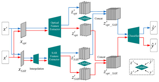 Architecture of MDACCN. and denote the source domain instances and target domain instances , and and denote the optical and SAR features, respectively. LMMD needs four inputs: the true label the predicted label , and the activated intermediate features and