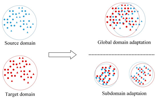 Global domain adaptation and subdomain adaptation (Blue and red represent the source domain and target domain, respectively. Circles and squares represent different categories).