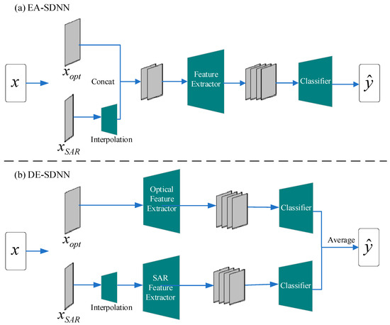 We carried out a comprehensive comparison to evaluate the performance of the proposed model. First, the accuracies of the MDACCN with different modal inputs were compared to verify the importance of the multi-modal data. In particular, the corresponding branch in the model was frozen when a particular modal datum was not inputted. Second, the early fusion scheme and decision fusion scheme were used to reconstruct MDACCN to explore the influence of the fusion scheme on model performance. The structures of early-and decision-fusion-based models are described in Figure 5. Finally, the well-trained models were used to generate the predicted crop maps in the target domain, and the maps were compared with the reference maps to assess the mapping performance of the models.