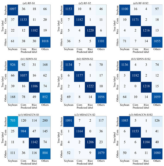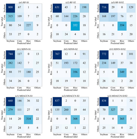 Confusion matrixes were further computed to show the distribution of predictions for each crop type using the testing data. In the source domain (Figure 6), the SDNN trained using S2 features exhibited higher accuracy in almost every class of crop compared with other models. By using S2 or S1S2 features, RF and MDACCN were also capable of accurately identifying the crops, only slightly inferior to the SDNN. However, all models trained using S1 features showed lower accuracy for each crop except rice. In the target domain (Figure 7), all models exhibited a decline in accuracy for each class. The MDACCN trained using S1S2 features was the only model that performed well in recognizing soybean, corn, and rice, with an OA exceeding 0.8, indicating the effectiveness of multi-modal data in transfer learning. It should be noted that all models struggled to accurately identify the “others” category. Although MDACCN had the largest number of samples correctly classified in the “others” category, its accuracy was still below 0.5.