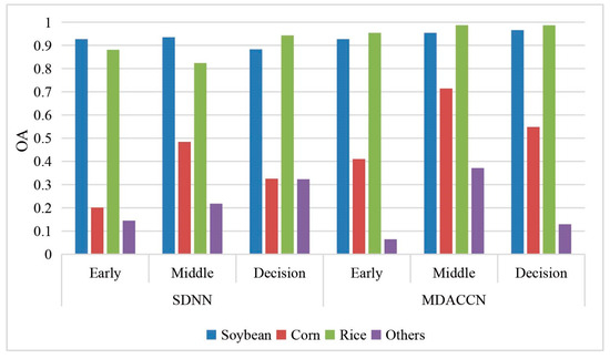 The classification results of the models using three fusion strategies for each crop in the target domain are depicted in Figure 8. It is evident that the models with the middle fusion scheme exhibited superior identification accuracy for each crop compared with other schemes. The decision-fusion-based models demonstrated a clear advantage over early-fusion-based models in corn and “others” identification. Owing to the domain adaptation, the MDACCN showed superior performance over the SDNN in identifying crops in the target domain with each fusion scheme. It is worth noting that the accuracy of the model was still relatively low for corn and “others”. According to Figure 7, the model tended to misclassify the corn as soybean, which may be attributed to the similar phenological characteristics of the two crops. As for the “others”, the other crop types were grouped as “others” except the main crops. The variation of the “others” between the source and target domains induces low classification accuracy. However, among the models with different fusion strategies, the middle-fusion-based MDACCN proposed in this study achieved the best and most balanced classification results.