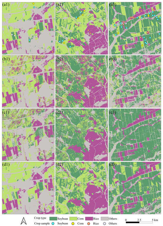 To explore the crop mapping performance in practice, the middle-fusion-based deep learning models were applied to produce the crop-type maps for the three mapping areas (Figure 1b) in the target domain. The center point coordinates of mapping areas (1)–(3) are (43.844N, 124.649E), (46.891N, 129.971E), and (47.720N, 127.208E), respectively. The area of each mapping area is about 100 km2. Since there is no official crop distribution map in China, the 2019 crop map in Northeast China provided by You et al. (2021) [55] was utilized as a reference map, which was proved to have high accuracy with an OA of 0.87.