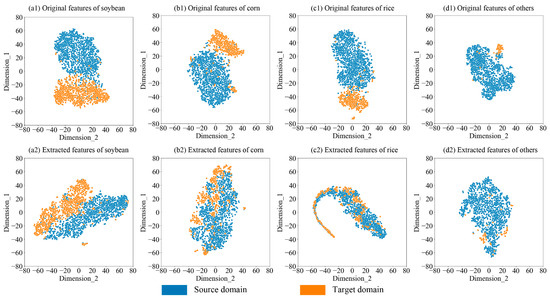 Distributions of (1) original SAR features and (2) extracted SAR features of (a) soybean, (b) corn, (c) rice, and (d) “others” using the testing data of the source and target domains.