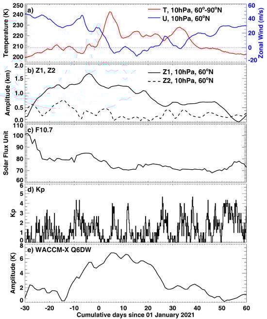 Temporal variations in (a) stratospheric polar temperature at 60–90°N, 10 hPa (red) and zonal mean zonal wind at 60°N, 10 hPa (blue), (b) the amplitude of planetary waves with zonal wavenumber 1 (solid) and 2 (dashed) at 60°N, 10 hPa, (c) F10.7 cm solar radio flux, (d) Kp index, and (e) the amplitude of the westward wavenumber-1 Q6DW in temperature given by WACCM-X simulation (LA + S/G) with respect to the cumulative days from 1 January 2021.