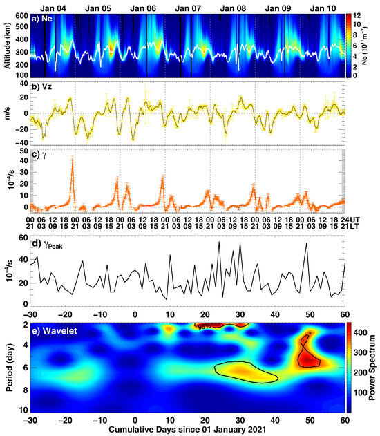 Ionosonde observations: of (a) Ne profiles and hmF2 (F2-region peak height). (b) F-region vertical plasma drift at Sao Luis during 4–10 January 2021. (c) Temporal fluctuation of the derived linear growth rate of the R-T instability. (d,e) Day-to-day variation in postsunset maximum values of R-T instability growth rate and corresponding wavelet analysis with respect to cumulative days since 1 January 2021.