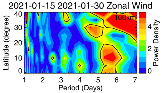 Periodograms of the ICON/MIGHTI zonal winds measurements at 100 km during 15–30 January 2021.
