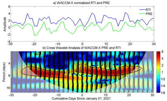 (a) WACCM-X simulations (LA only) of the normalized growth rate of the R-T instability (blue) and normalized PRE (green) with respect to the cumulative days from 1 January 2021. (b) Cross-wavelet analysis of the WACCM-X normalized R-T instability and PRE time series. The relative phase is represented by black arrows, pointing right for in-phase and left for antiphase.