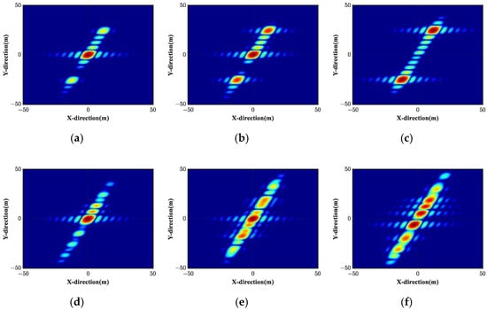 BP images of multi-monostatic GEO SARs with various frequency errors: (a) ; (b) ; (c) ; (d) ; (e) ; and (f) .