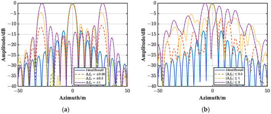 Azimuth profiles of multi-monostatic GEO SARs with various frequency errors. (a) Given frequency errors. (b) Random frequency errors.