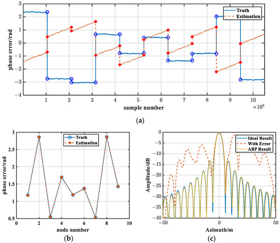 Assuming that the distributed system has a fixed frequency error of and random phase noise, the results of ABP are shown in Figure 10. Observing the true values in Figure 10a, it can be concluded that the phase error is mainly determined by the fixed frequency error, and the random phase noise is very small, so the phase error between the multi-monostatic platforms is segmented, where abrupt changes occur at the data connections between different platforms. The defocusing of the image is mainly determined by the mutation errors at these junctions, so the key to focusing the image is to correctly estimate the value of the phase error at the connections.