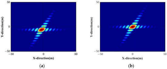 Figure 4dβf show BP images with frequency errors of , , and , respectively. The error for each radar in the multi-monostatic system is a random value within a range, which is a more realistic situation. Figure 5b compares their azimuth profiles with an ideal azimuth profile. Note that the image deviation caused by the large frequency error is neglected for a better comparison of the azimuthal profiles. As the error limit increases, which means the frequency stability decreases, the sidelobe interference and the image degradation worsens. When , multiple sidelobesβ levels are almost as high as the main lobe level that the real target cannot be distinguished.