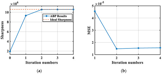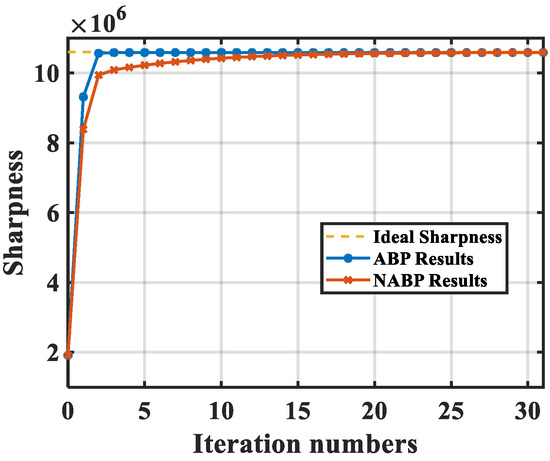 Some simulations are conducted to verify the ability of the NABP algorithm we proposed. The ABP algorithm takes 4 iterations to reach the iteration termination condition, while the NABP algorithm requires 31 iterations. The variation in sharpness values with the number of iterations is plotted in Figure 15. We find that the sharpness values using the NABP algorithm grow slowly, so more iterations are needed to achieve a similar effect with the ABP algorithm. Although the iteration condition is not reached, the sharpness values after 15 iterations are not far from the true values.