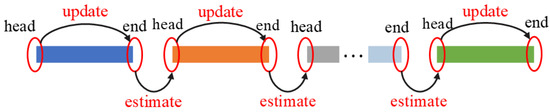 According to Equations (31) and (32), it is no longer necessary to update each , but only the at the head and the end of the segment. In the -th iteration, the of the -th segment head can be written as
