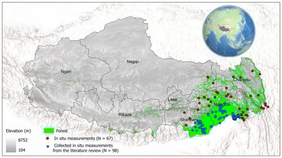 We conducted in situ measurements (N = 67, red dots in Figure 1) during 2019 and 2023 with a special focus on the elevational gradient. Here, we set the elevation intervals as 100 m, ensuring that at least one sample was collected every 100 m from 33 m (a.s.l.) to 4500 m (a.s.l.). Each plot was set as a square of 10 × 10 m. We then measured the diameter at breast height (DBH), and height of each tree (DBH > 5 cm) and also recorded tree types. The forest aboveground biomass was obtained using the allometric model of each tree type. The average biomass of these sample points is 135.4 MgC ha−1, with an average elevation of 4673.4 m. In addition, we compiled data documented in the literature (N = 98, blue dots in Figure 1). Data should be measured near or after the year 2015, and satisfy the following two criteria (1) the inventory should be conducted at the plot scale rather than at the individual tree level [49]; (2) data should be collected from stable sites with no recent fires or human disturbances, verified through high-resolution imagery on Google Earth (interpreted manually from Google Earth high-resolution images). Data recorded only forest aboveground biomass was transformed into biomass by the shoot-to-root ratio of 0.35, following Liu et al. [8]. The distribution of inventory data which met those criteria is shown in Figure 1. However, the observation data were obtained between 2015 and 2023, while our analysis focused on the period from 2015 to 2020. This temporal mismatch could potentially introduce uncertainties in our estimation.