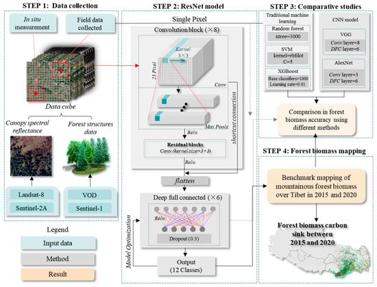 To provide a benchmark of mountainous forest biomass and estimated changes in biomass, that is the biomass carbon sink, we proposed a deep learning method that integrated a Residual Convolutional Neural Networks based model, ResNet, with a relatively large number of in situ measurement data, microwave remote sensing (Sentinel-1 and VOD), and optical imagery (Sentinel-2A and Landsat 8). Initially, we compiled multi-source remote sensing data covering the years 2015 to 2020. We then aligned in situ measurements with the remote sensing data to ensure spatial consistency, incorporating neighboring information as additional input for ResNet regression (Step 1 in Figure 2). Subsequently, we trained and optimized the ResNet model to minimize the loss value (Step 2 in Figure 2). The well-optimized ResNet model was then deployed to predict regional forest biomass at the pixel level. Changes in forest biomass were subsequently translated into forest biomass carbon sink (Steps 3 and 4 in Figure 2).