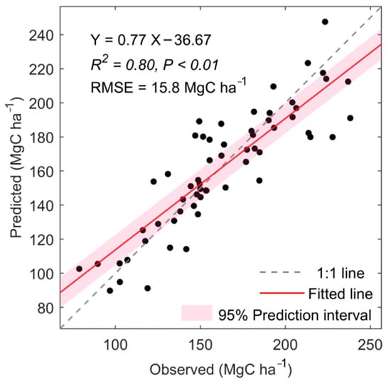 Relationship between the independent in situ measurement and the predicted forest biomass. The solid blue line and the dashed black line represent the regression line and 1:1 line, respectively. Here, independent samples (N = 62) were only used for verification. R2 represents the coefficient of determination, and RMSE is the root mean squared error.