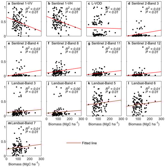Relationship between the forest biomass and the multi-source remote sensing data at field measurement scale. The subplots reveal data using multi-source remote sensing data, including (a) VV, (b) VH bands from Sentinel-1, (c) Vegetation Optical Depth (VOD), (d–g) reflectance data from Sentinel-2, and (h–l) Landsat 8. All remote sensing-based data have been normalized.