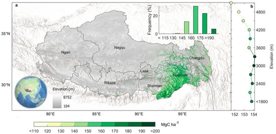 After obtaining satisfactory validation results at the plot scale, we proceeded to generate a comprehensive wall-to-wall forest biomass map for the year 2020 (Figure 5). Our analysis revealed that regional forest biomass ranges from 95.2 to 275.3 MgC ha−1, with an average of 162.8 ± 21.3 MgC ha−1. This equals a total carbon storage of approximately 2.05 PgC, constituting 40.2% of the entire forest carbon storage 5.10 PgC on the Tibetan Plateau [55]. Notably, the mountainous forests harbor high carbon density, with nearly 90% of the forest biomass exceeding 135 MgC ha−1. This is significantly higher than forests in eastern regions at similar latitudes in China (86.0 ± 10.6 MgC ha−1) [56], as well as flat regions (slopes lower than 10 degrees) in China (61.3 ± 22.4 MgC ha−1). Forest biomass reveals large spatial variation, regions with higher forest biomass are predominantly concentrated in Shannan City, situated in the southeastern part of Tibet, where the average biomass is approximately 1.24 times higher than that of the entire Tibetan region (202.4 ± 24.3 MgC ha−1). Conversely, regions such as Nagqu and Chamdo in northeastern Tibet exhibit relatively lower forest biomass, attributed to the constraints of low temperature and limited water availability. Furthermore, forest biomass exhibits significant variation with the elevation. With increasing elevation, the forest biomass accumulation began to be inhibited.